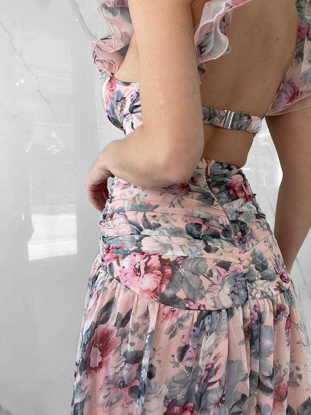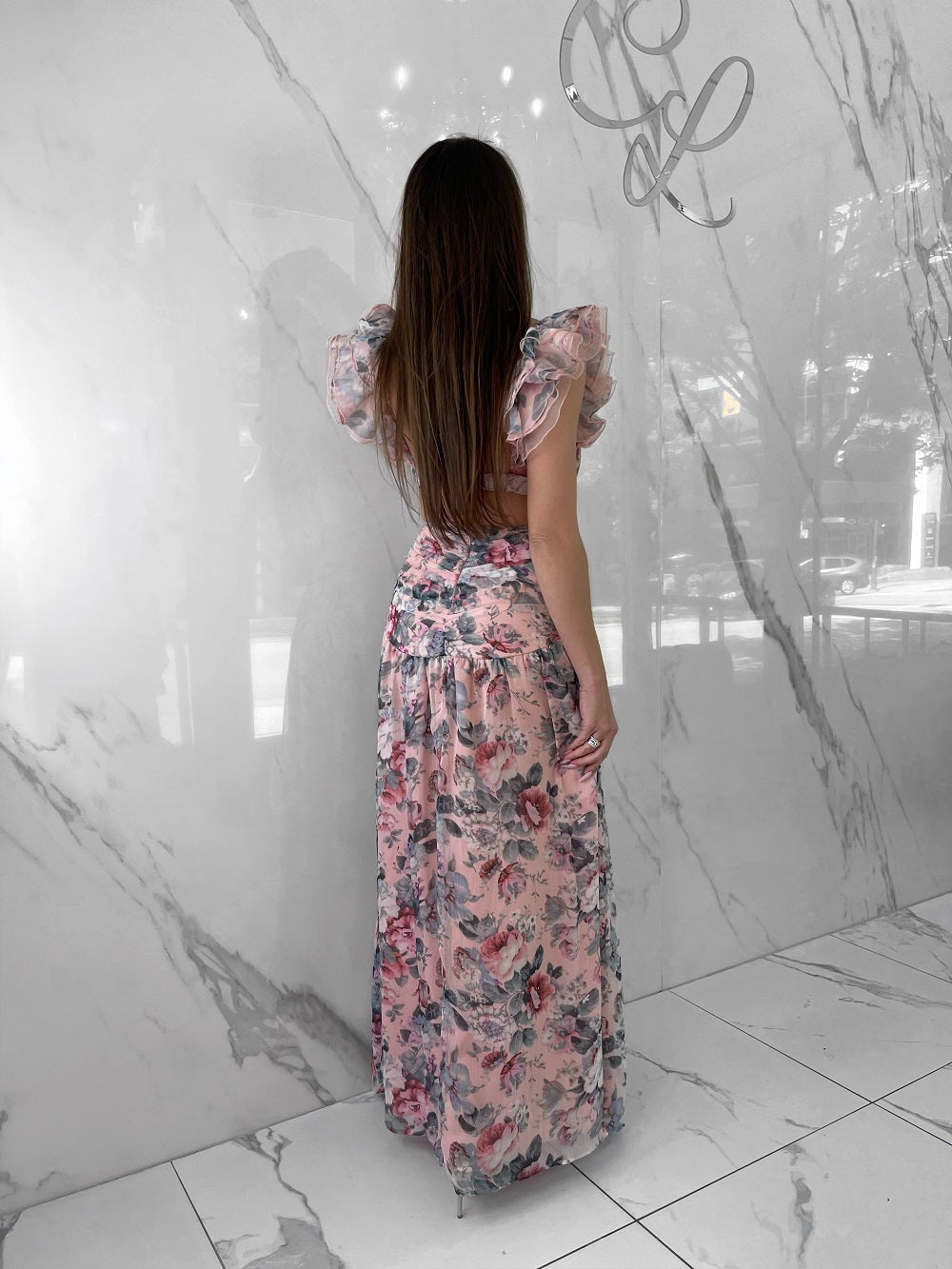Bask in the romance of the 'Admired' maxi dress, where fun meets flirty in a symphony of pink petals. This dress captures the essence of a blooming garden on a sun-kissed day, with delicate floral patterns sprawling across its length. Fluttering ruffle sleeves and a plunging V-neckline provide a charming allure, while the cinched waist and flowing skirt promise a silhouette that's both graceful and spirited. Ideal for breezy summer soirees or whimsical garden parties, this dress is a love letter to the joyful days spent under the open sky.