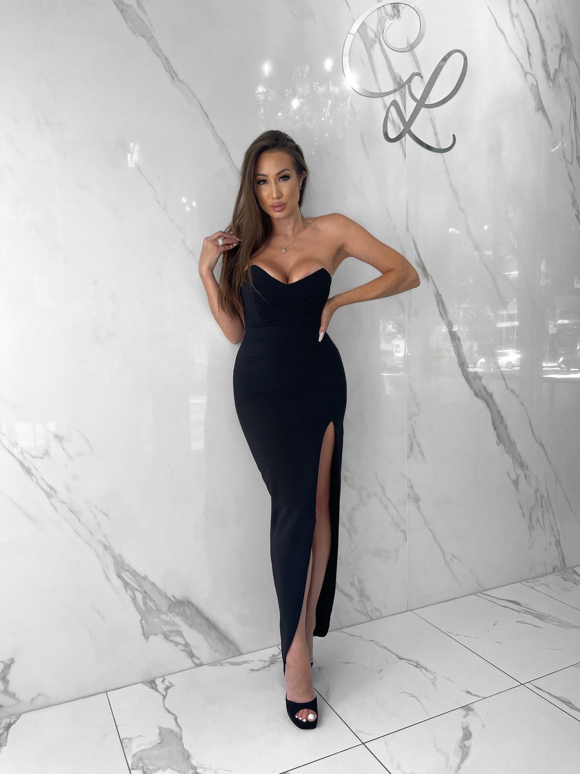 Classic and beautiful, the 'Joy' dress in black  features a strapless neckline, built-in corset, padding, and tummy ruching for added support and a flattering fit. With a thigh-high slit and elegant design, it’s perfect for special occasions or making any moment unforgettable.