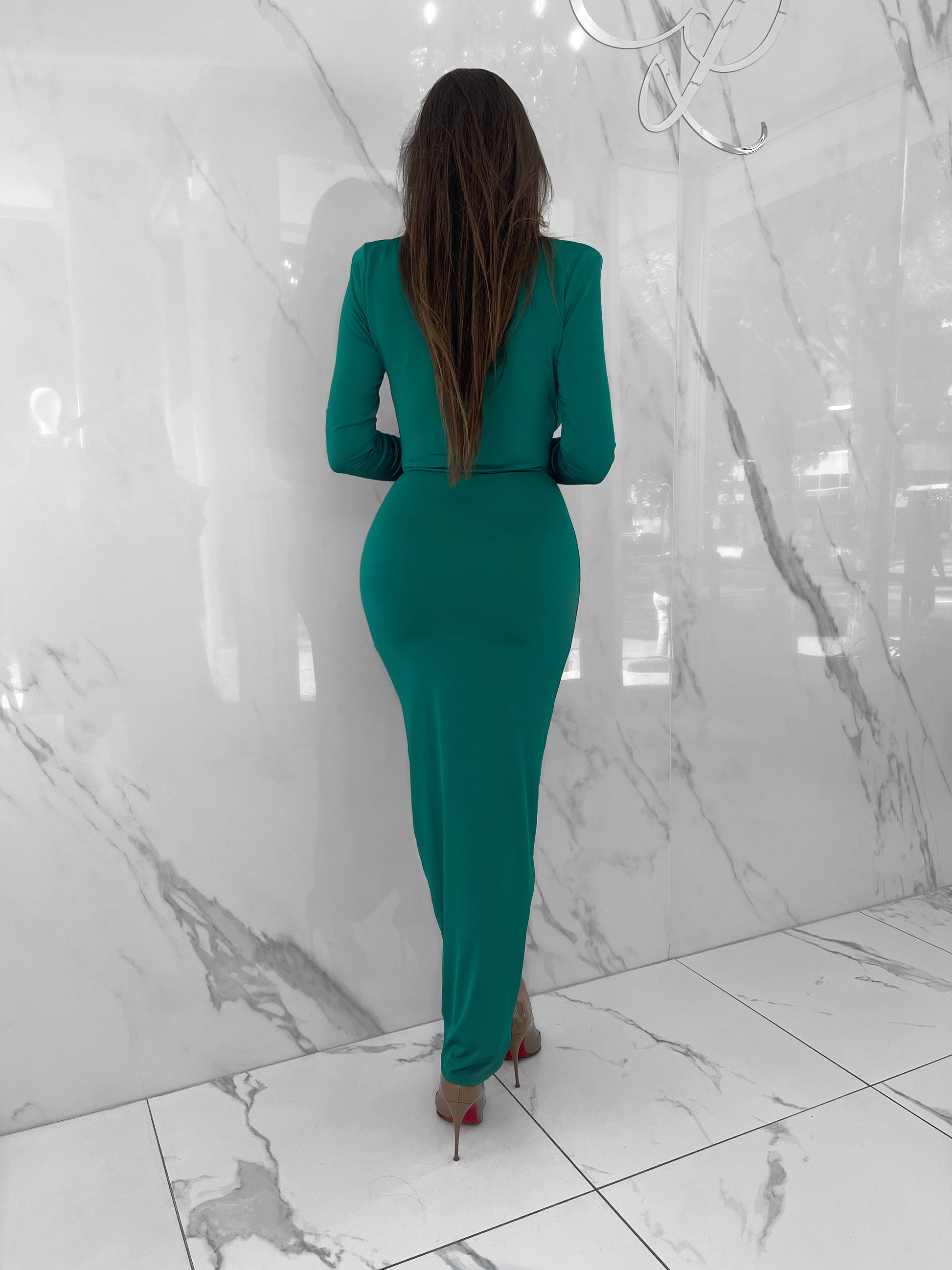 Break hearts in the 'Make It Rain' dress,  in a bold deep green. Featuring a plunging neckline, long sleeves, and a tie-front detail to accentuate your waist, this dress offers a flattering silhouette with a subtle slit for added elegance. Made from stretch fabric, it ensures all-day comfort while exuding confidence and sophistication—perfect for formal events or special nights out.