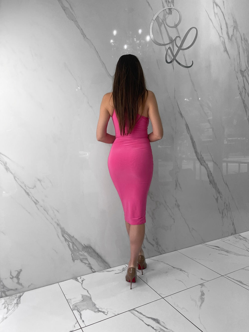 The bodycon fit on this dress is AMAZING. The fabric is doubled lined with thick but ultra stretchy fabric. It leaves you feeling all tucked in as if it was Spanx. It features a one shoulder look, and chest cut out.