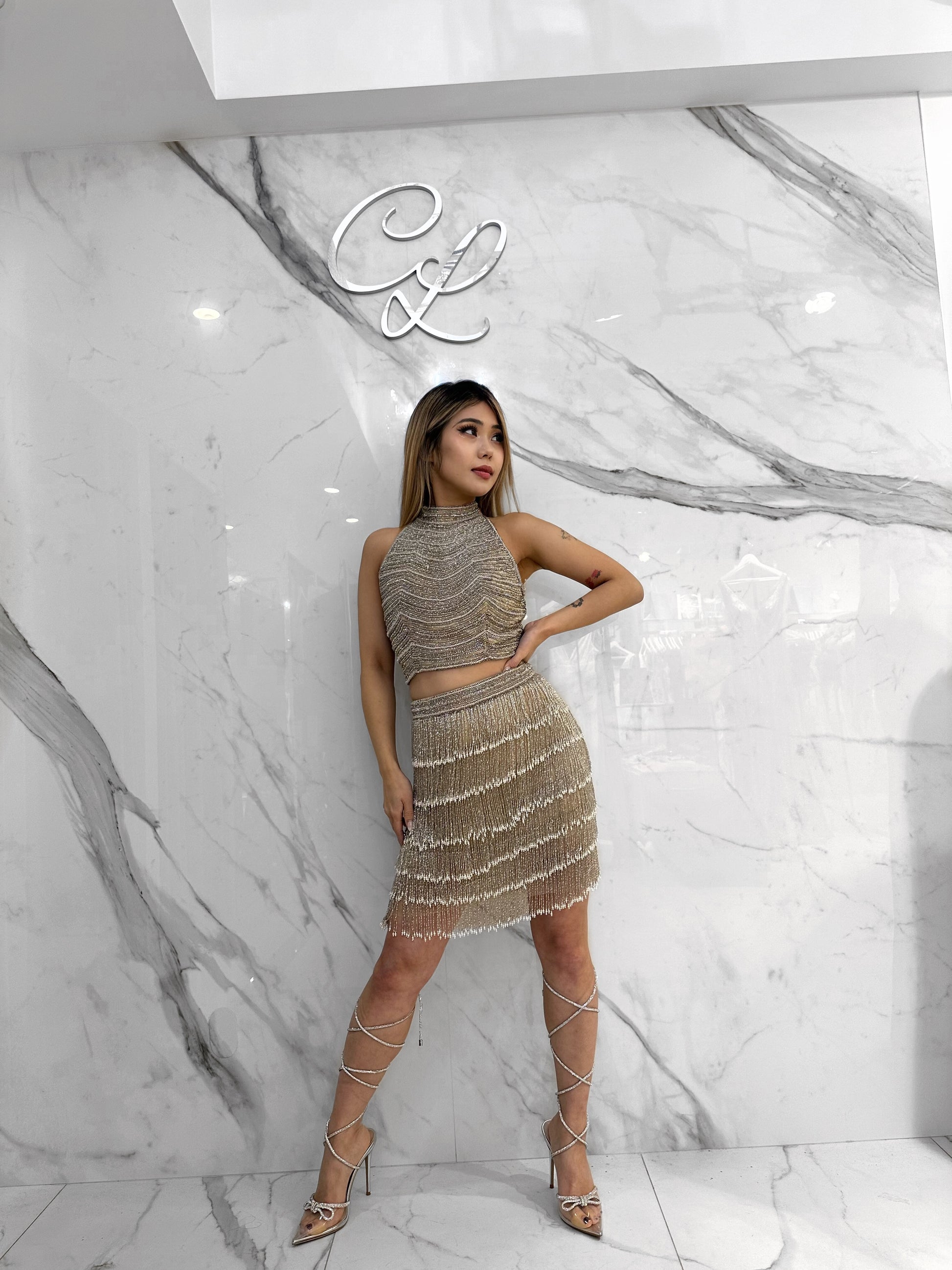 This "Sherri Hill" 2-Piece Set is a dazzling ensemble that’s perfect for making a statement. Featuring intricate beadwork and layered fringe, this golden-silver set sparkles with every move. The cropped top pairs effortlessly with the high-waisted skirt, offering a bold yet elegant look for glamorous nights and special events. All eyes on you in this show-stopping outfit