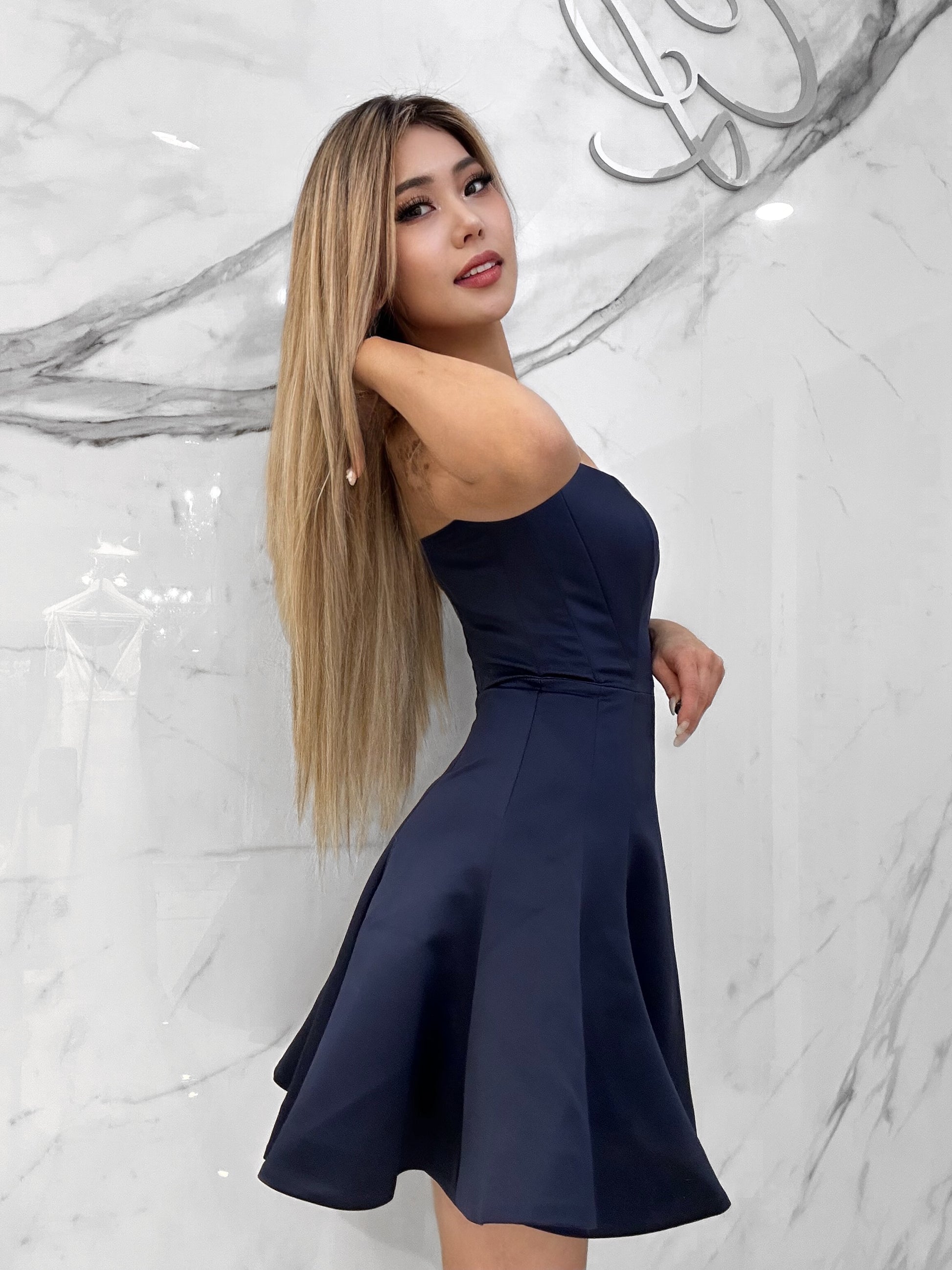 The "So-ju' Dress is a sleek and sophisticated navy-blue mini dress that flows effortlessly with every step. Featuring a structured bodice and a flared skirt, it offers the perfect balance of elegance and charm for any special occasion or night out. Comfortable and flattering, this dress is your go-to for a timeless, chic look.